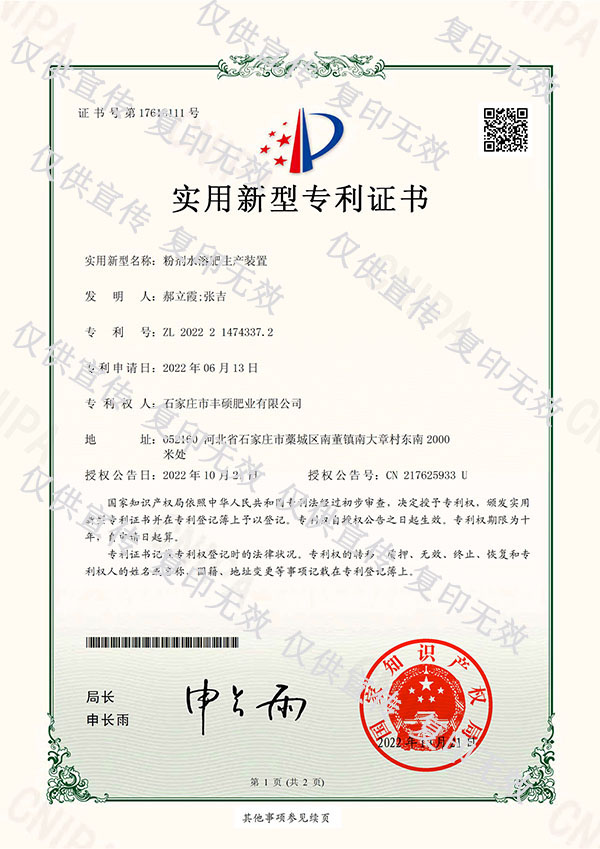 粉劑水溶肥生產(chǎn)裝置專利證書