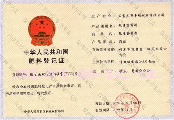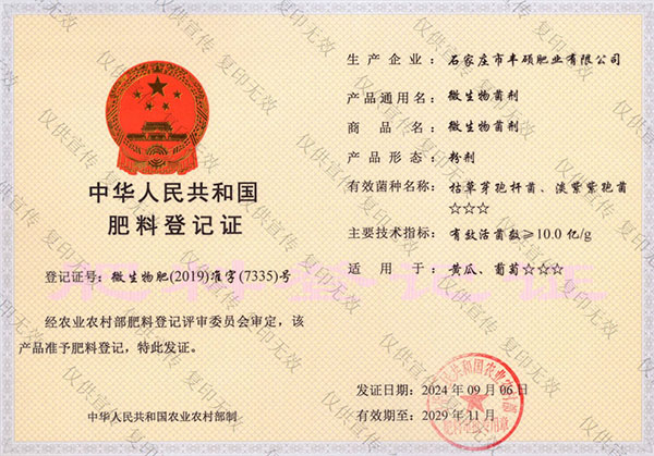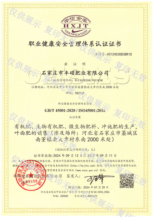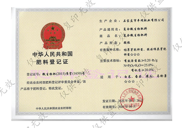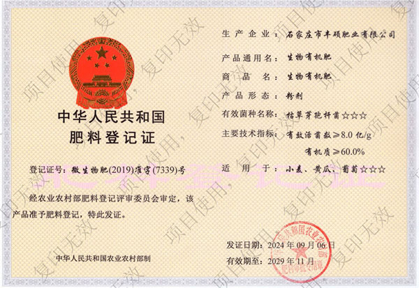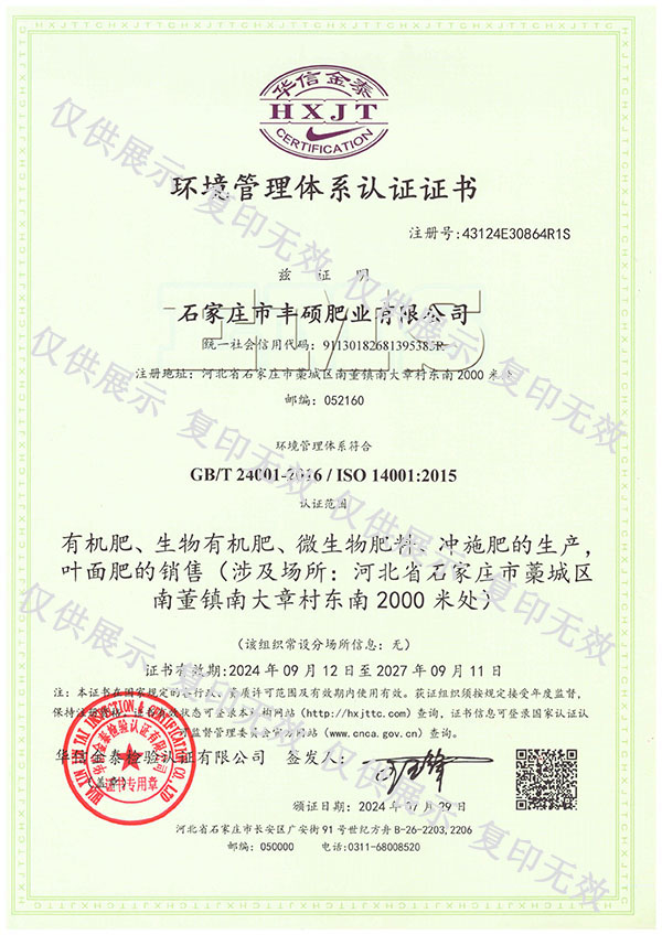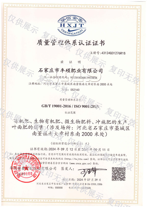 石家莊市豐碩肥業(yè)有限公司是一家集新型肥料的研發(fā)、制造、營(yíng)銷、服務(wù)于一體的高新技術(shù)企業(yè),公司自2008年創(chuàng)辦以來,一直致力于新型肥料的技術(shù)研發(fā)和市場(chǎng)推廣。公司組建了豐碩新型肥料研究中心(院士專家企業(yè)工作站),自主知識(shí)產(chǎn)權(quán)研發(fā)團(tuán)隊(duì)專業(yè)科研人員20余人,獲得了多項(xiàng)肥料國(guó)家發(fā)明專利。公司目前已擁有發(fā)酵類有機(jī)肥、微生物菌劑、生物有機(jī)肥、土壤調(diào)理劑、大量元素水溶肥、含腐植酸肥料、含氨基酸肥料、中微量元素肥料等8大品類,“金維克”、“豐碩沃農(nóng)”等2大自有品牌,擁有20多個(gè)暢銷品種。目前,我公司已經(jīng)通過了“ISO9001 質(zhì)量管理體系認(rèn)證”、“ISO14001 環(huán)境管理體系認(rèn)證”、“OHSAS18001 職業(yè)健康管理體系認(rèn)證”。...